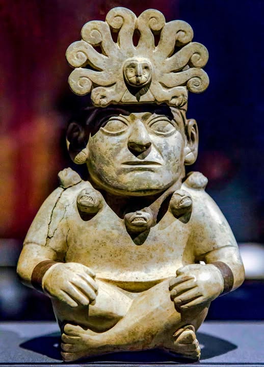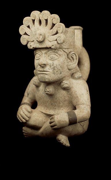 This Moche ceramic stirrup vessel, created in northern Peru around 525–550 AD, is modeled in the form of a seated figure, reflecting the Moche tradition of producing highly expressive, narrative ceramics.