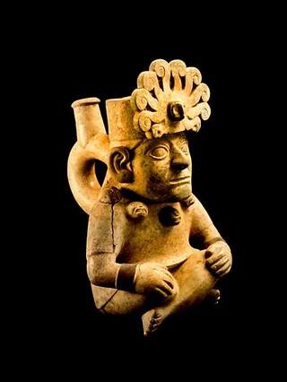Moche Ceramic Stirrup Vessel in the Shape of a Seated Figure – from Peru, dating to ca. 525–550 AD.
