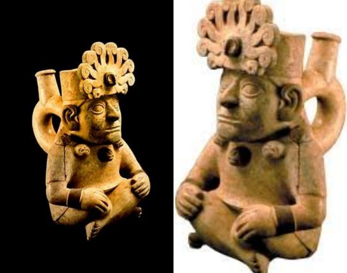 Moche Ceramic Stirrup Vessel in the Shape of a Seated Figure – from Peru, dating to ca. 525–550 AD.