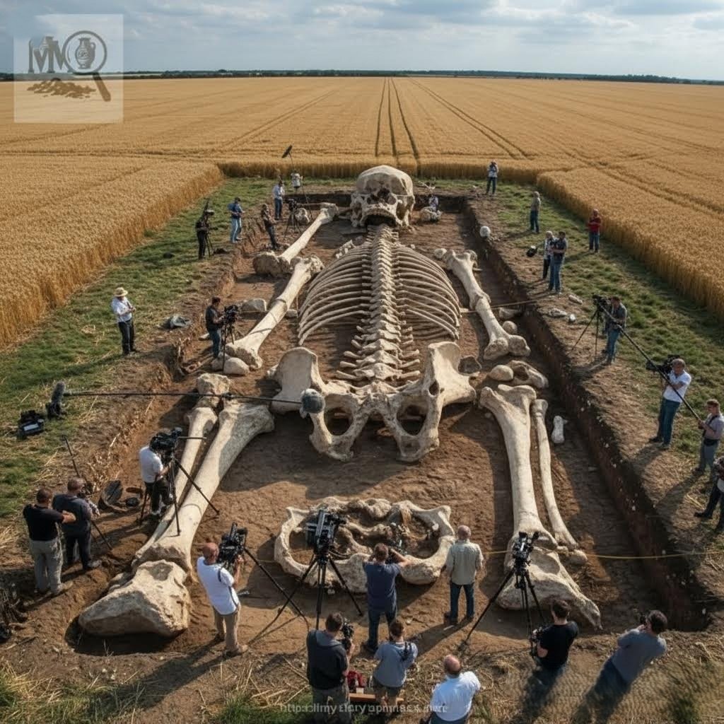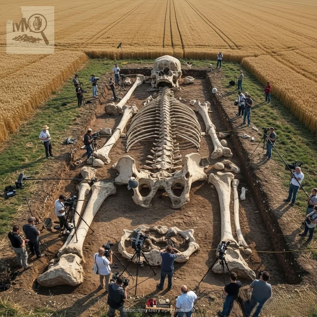 In the middle of a peaceful countryside—where golden wheat normally sways undisturbed in the wind—a discovery of unimaginable proportions has shattered the quiet. Beneath the soil of an ordinary farming field, archaeologists have uncovered a massive humanoid skeleton, so enormous that it challenges the boundaries of science, history, and belief.