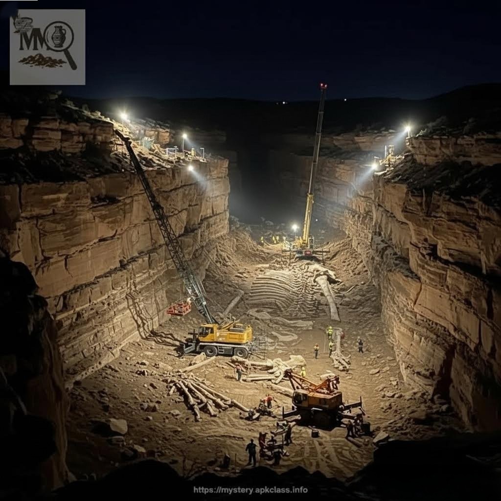 Under towering cliffs and blinding floodlights, teams of specialists work in tense silence as they brush away the earth from what appears to be an enormous humanoid skeleton. Its ribcage alone spans wider than the heavy machinery operating beside it, a scale so unimaginable that even seasoned archaeologists are visibly shaken. Cranes groan under the weight of bone fragments being lifted out of the rock bed, while armed security patrols keep reporters at a distance.