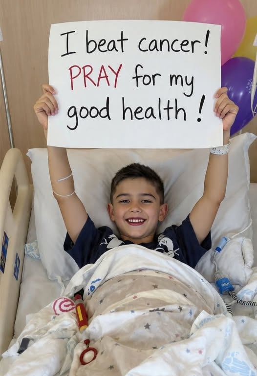 There are moments in life that touch our hearts so deeply that we pause and breathe differently. There are stories—simple yet powerful—that carry enough strength to inspire millions. The image of a young boy lying in a hospital bed, smiling brightly while holding a sign that reads “I beat cancer! Pray for my good health!” is exactly one of those moments.