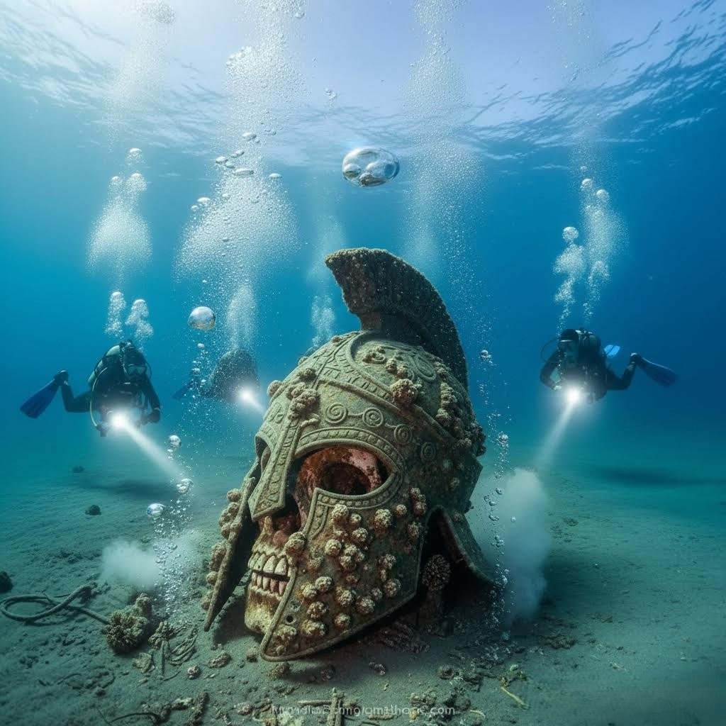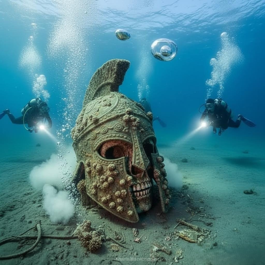 Deep beneath the shimmering, ethereal blue of the ocean, a team of professional deep-sea divers and maritime archaeologists has inadvertently made a discovery so utterly surreal and monumental that it has instantaneously ignited a global firestorm of intense debate across scientific forums and social media platforms. Resting silently and partially buried in the soft sediment of the seafloor lies an enormous warrior helmet—an artifact of such impossible scale that it challenges the very foundations of known human history and civilization.