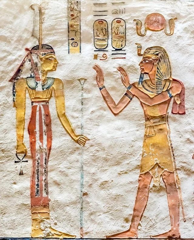 Its walls and ceilings are covered with vivid paintings of deities, protective spells, and astronomical texts, including a magnificent depiction of the sky goddess Nut arching over the burial chamber.