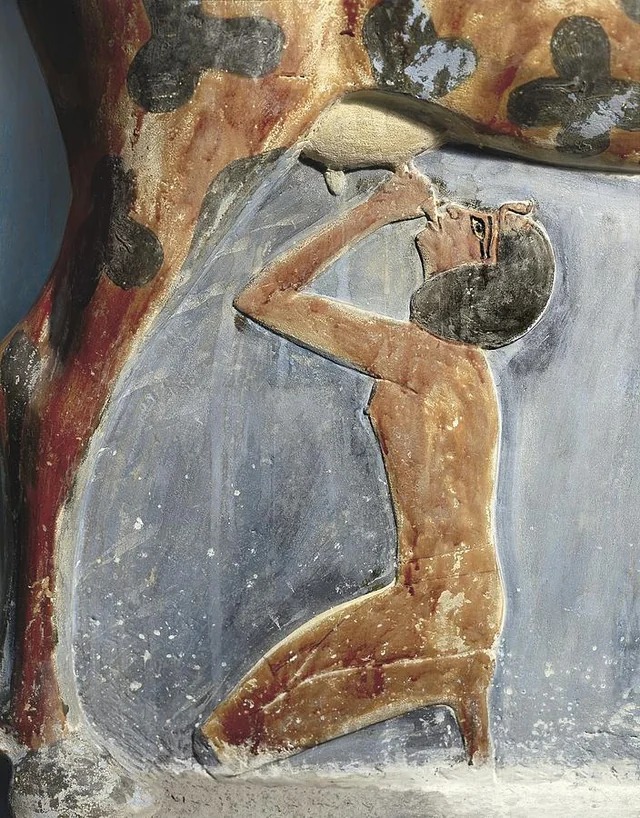 Dating to the New Kingdom, 18th Dynasty (1427–1401 BC), it depicts Hathor, the protective cow goddess, lovingly 𝘣𝘳𝘦𝘢𝘴𝘵𝘧𝘦𝘦𝘥𝘪𝘯𝘨 the young prince, who would later become Pharaoh Amenhotep II  .