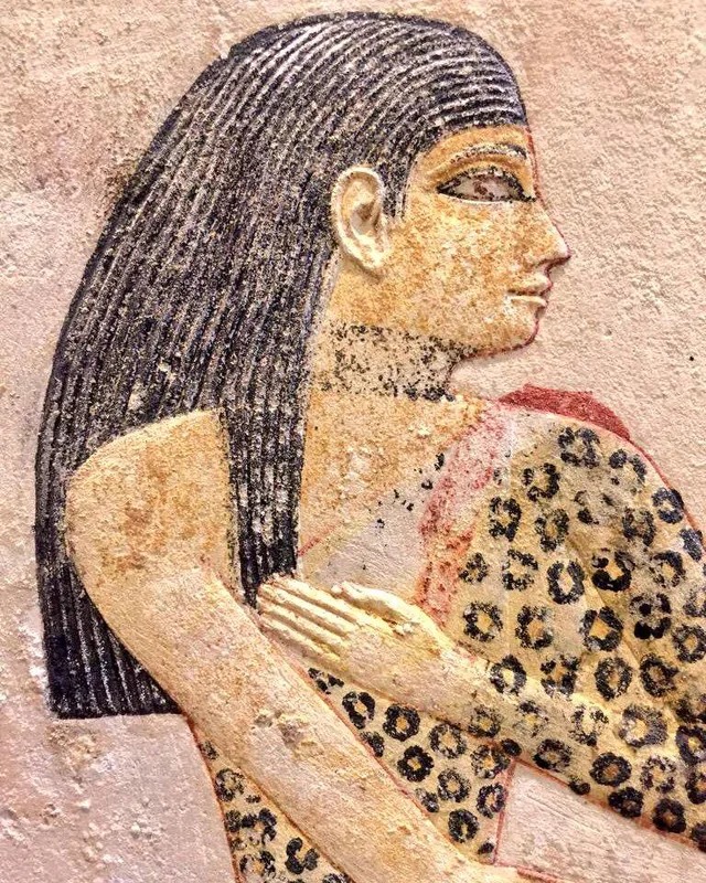 Nefertiabet was most likely a daughter of King Khufu, and she is shown here wearing a dress made of leopard or panther skin, complemented by a choker-style collar.