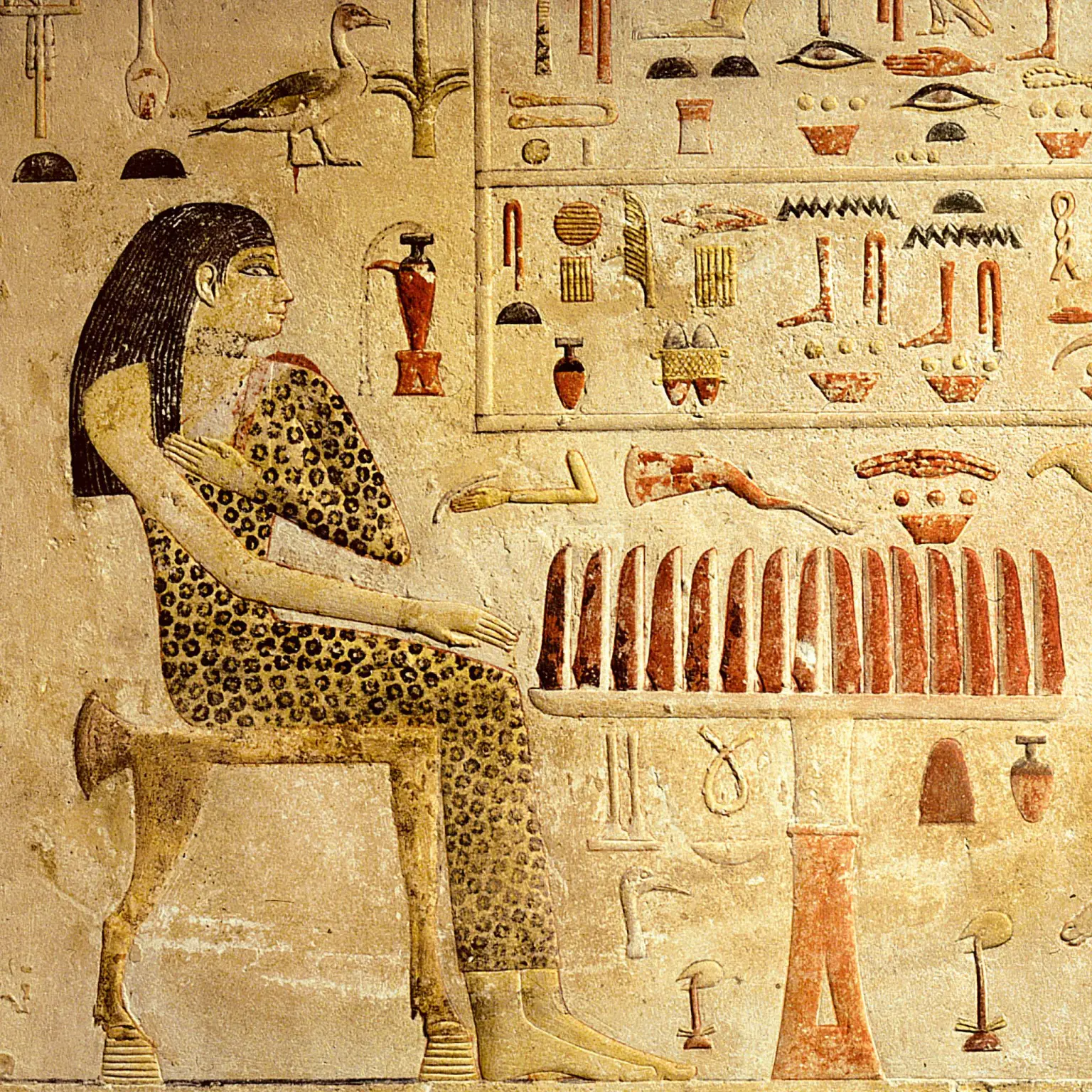 Nefertiabet is shown seated and facing right, wearing a long wig and a garment made of panther skin. In front of her stands an offering table topped with reeds, a common symbol representing “the products of the field,” along with a variety of additional food offerings.