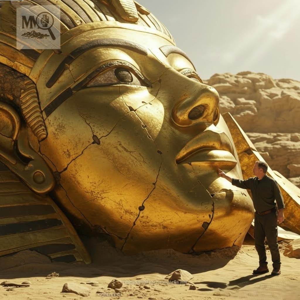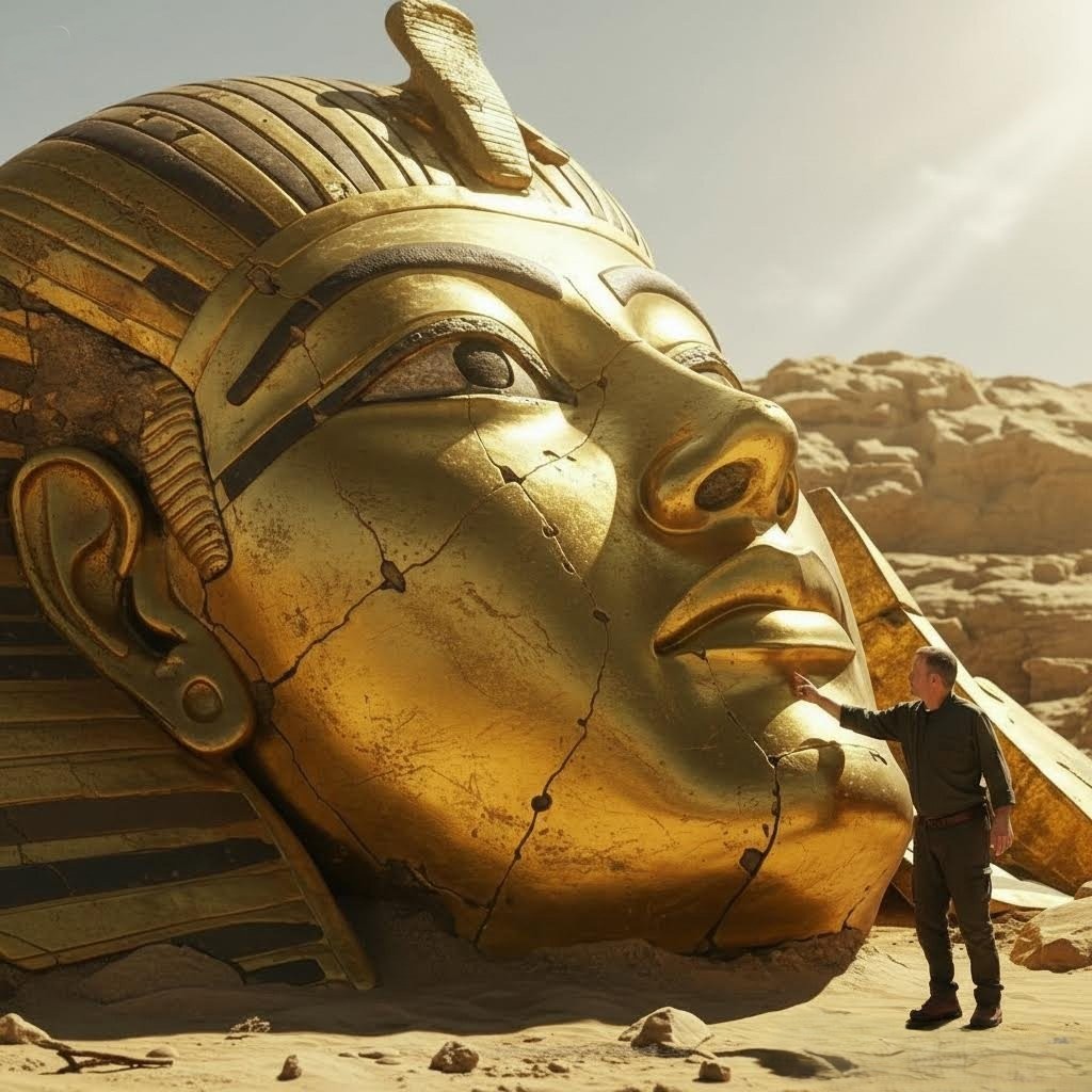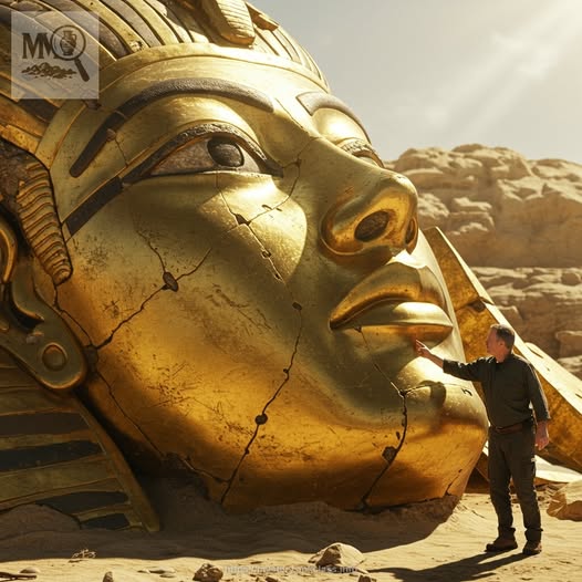 An extraordinary sight has stopped the world in its tracks: a colossal golden face, half-buried beneath shifting desert sands, its polished surface gleaming under the relentless sun. The sheer scale of the object is breathtaking—an explorer standing beside it appears no taller than its lower lip, emphasizing just how monumental this discovery truly is.