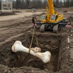 Photos and footage reveal towering rib bones curving skyward like the arches of an ancient cathedral, vertebrae the size of boulders, and excavation crews dwarfed by the sheer scale of the find. Heavy machinery surrounds the site—cranes, diggers, floodlights—giving the entire scene the look of a blockbuster film set rather than a typical archaeological dig. And that’s exactly where the controversy begins.