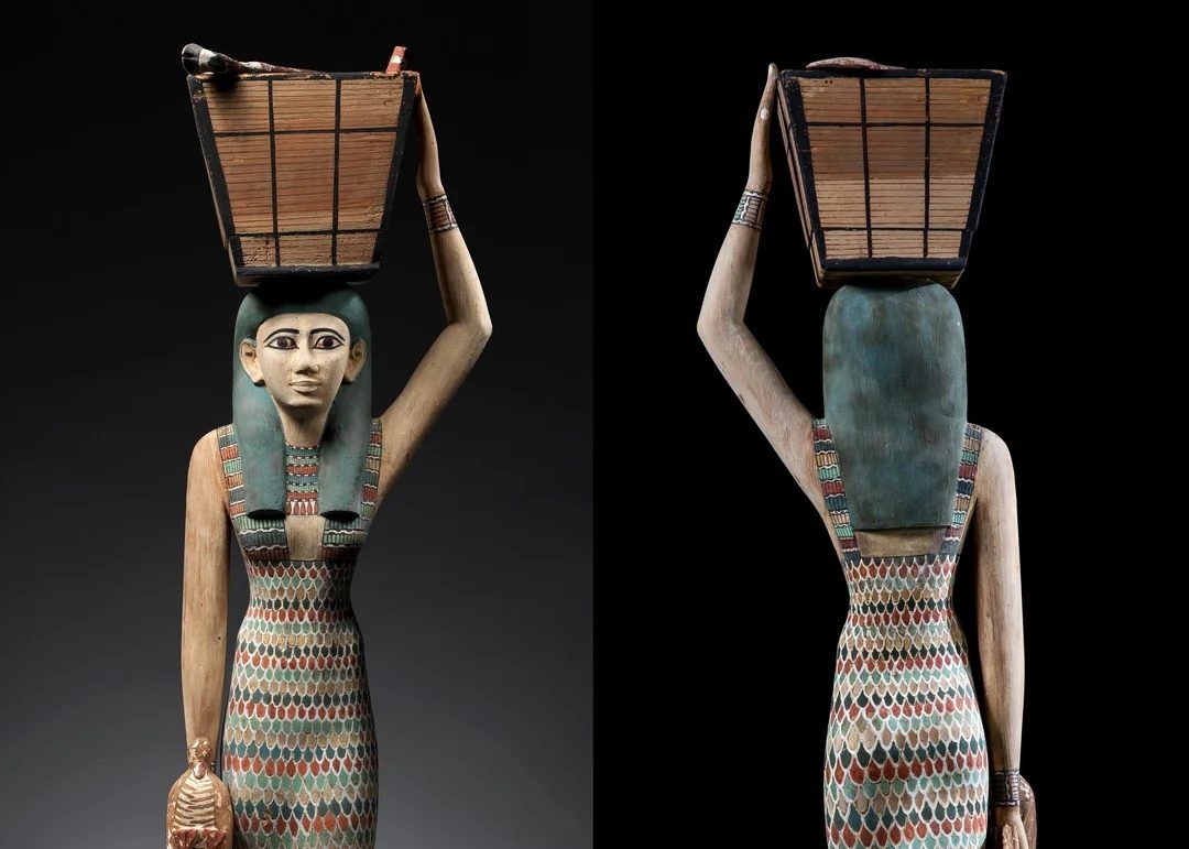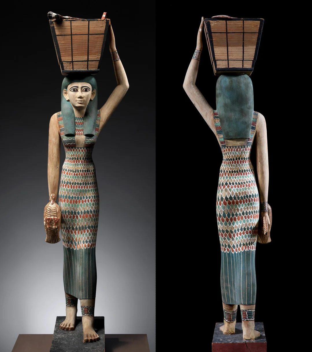 Statue of a woman carrying a basket of meat on her head.   Originating from Egypt’s Middle Kingdom (1981–1975 BC), this sculpture reflects daily life and the artistry of ancient Egyptian society.