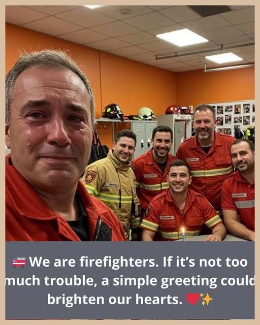 In the image, a group of firefighters sits together inside what appears to be their station. Some are smiling softly, wearing their uniforms with pride. One firefighter in the foreground has tears on his face—tears that say far more than words ever could. Behind them are lockers, helmets, and the familiar tools of their profession. But beyond the equipment, what stands out the most is the emotion: a mixture of exhaustion, relief, and quiet strength.