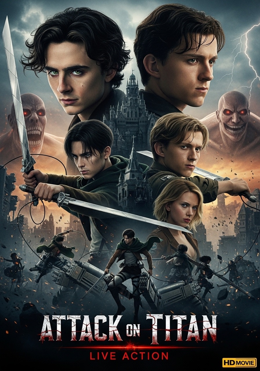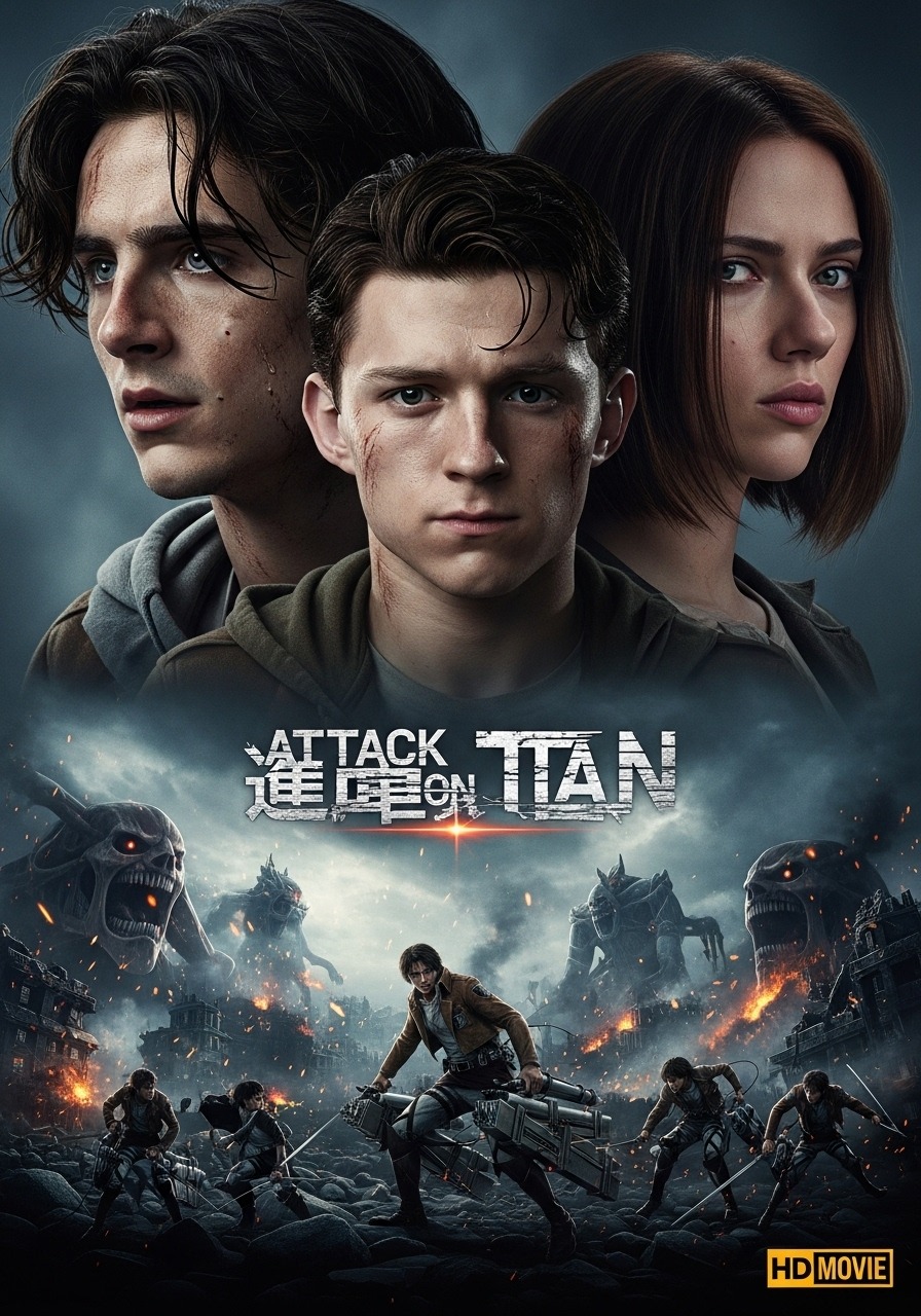 Timothée Chalamet embodies Eren Yeager, a young man consumed by vengeance and driven by the dream of freedom beyond the walls. His fiery determination is matched by Scarlett Johansson, portraying a battle-hardened soldier whose courage and sacrifice becomes the backbone of humanity’s resistance. Tom Holland brings depth and vulnerability to the role of a skilled but conflicted fighter, torn between loyalty, fear, and the hope for a future that seems impossible.