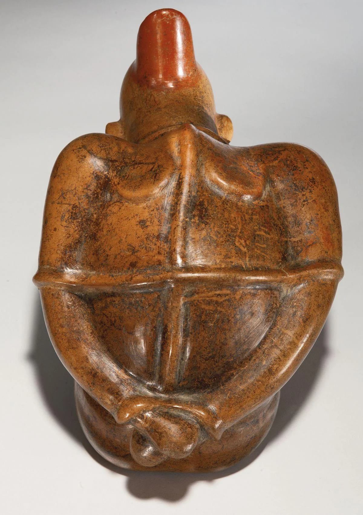 Scholar Peter Furst has proposed that these restrained figures may instead depict shamans undergoing initiation rites, during which they must free themselves to demonstrate their supernatural abilities. The finely modeled back of this figure is particularly striking, bearing a form that resembles the carapace of a turtle.