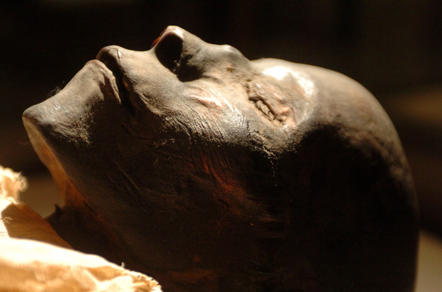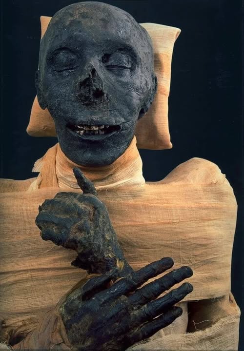 It was badly damaged by tomb robbers, likely during the 21st Dynasty (ca. 1069–945 BCE). To transport the royal 𝘮𝘶𝘮𝘮𝘪𝘦𝘴, narrow wooden splints were used to hold the body together.
