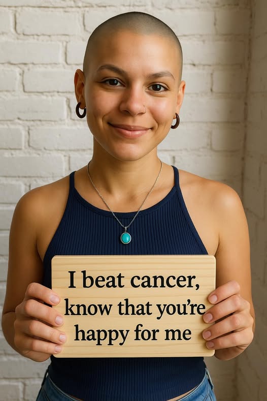 There are moments in life that make us pause, breathe deeply, and realize we have just walked through a journey we never believed we were strong enough to survive. When you look at the image of the young woman holding a wooden sign that says, “I beat cancer, know that you’re happy for me,” you can almost feel the emotion behind her gentle smile and bright eyes. Her expression reflects relief, pride, and the quiet strength that only those who have fought a long, exhausting battle can understand.