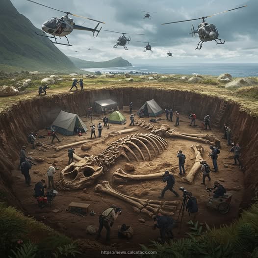 A remote coastline excavation has ignited intense global attention as research teams, journalists, and aerial monitoring units gather around the partially uncovered remains of a massive humanoid figure buried deep beneath the terrain. Although no verified academic or scientific institution has confirmed the find as anything beyond an unusual archaeological curiosity, the scale of the scene itself has fueled an extraordinary surge of speculation.