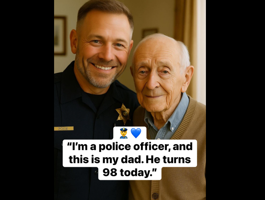 Có thể là hình ảnh về văn bản cho biết 'POIGE "I'm a police officer, and this is y dad. He turns 98 today."'