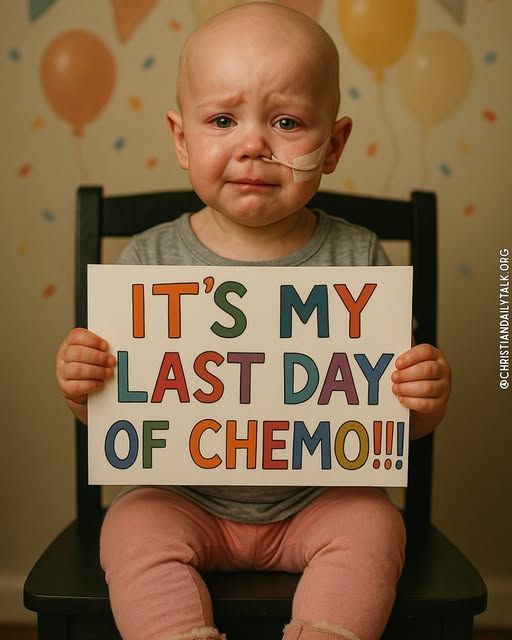 Then came the final stretch—the last treatments, the last long nights, the last countdown to freedom. And one morning, in a room decorated with soft balloons and glowing with quiet hope, the little girl held up a sign with shaky hands: