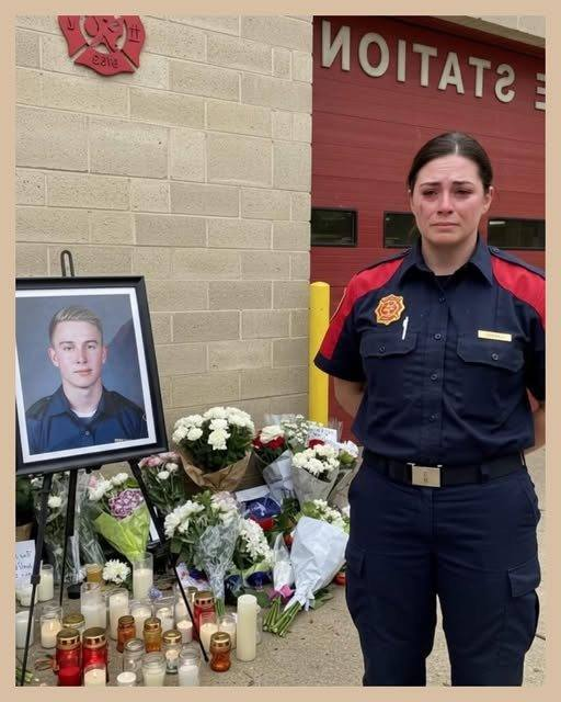 In front of the fire stationâwhere sirens once echoed, where laughter once filled the halls, where courage lived in every uniformâshe stood trembling. Behind her, a framed portrait of a fallen firefighter rested among flowers, candles, and handwritten notes. A tribute built by hands shaking with grief, love, and memories too heavy to carry alone.