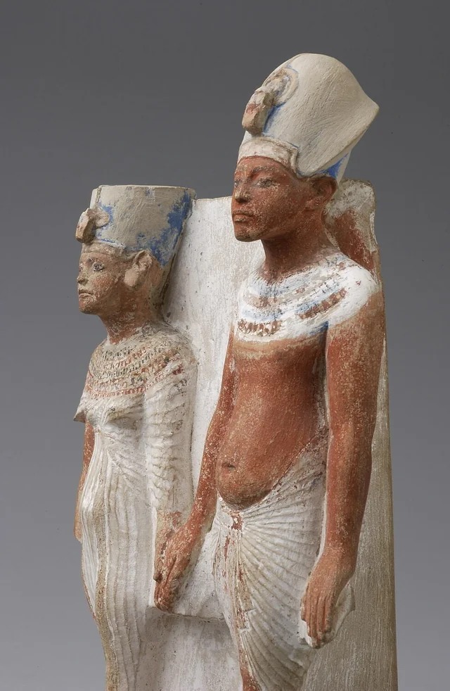 This statue depicts King Akhenaten and his Great Royal Wife Nefertiti, highlighting their close partnership and the distinctive Amarna artistic style