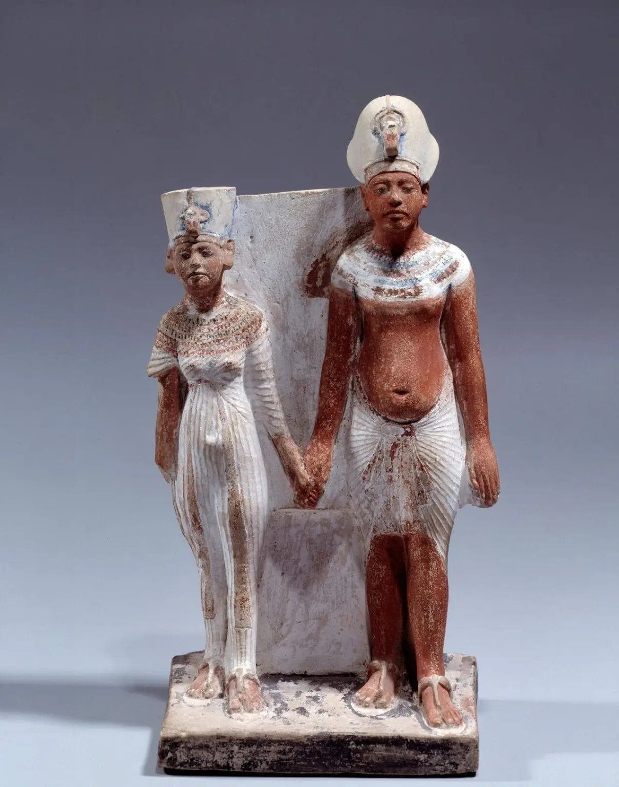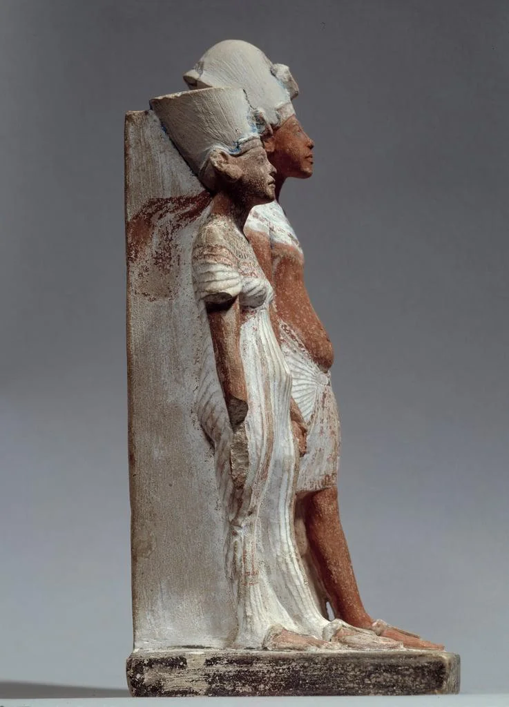 This small painted votive statue portrays King Akhenaten together with his Great Royal Wife, Nefertiti. The royal couple is shown hand in hand—a notably unusual gesture for New Kingdom art—as though advancing forward side by side.