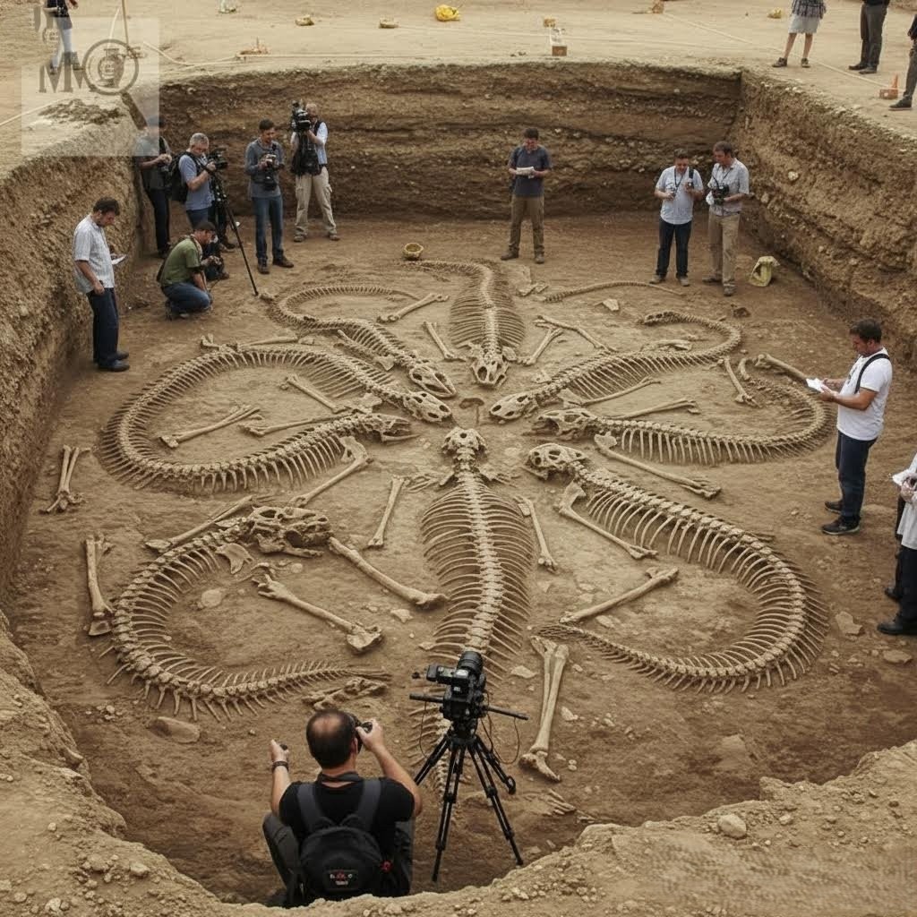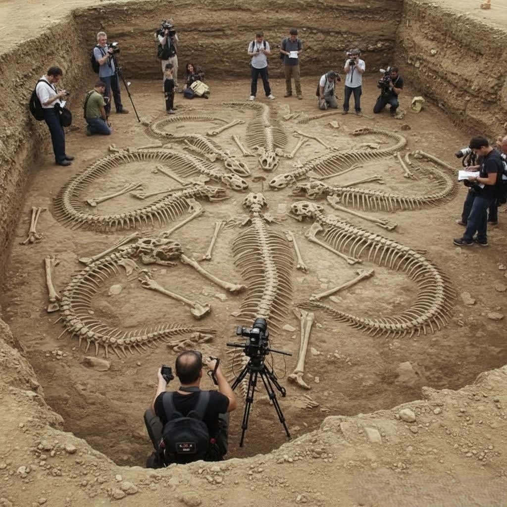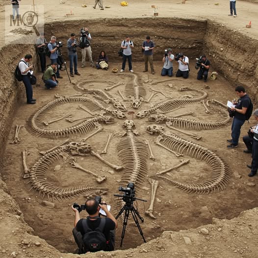 At a remote desert dig site now ringed by stunned reporters and hastily erected perimeter fencing, archaeologists have uncovered a discovery unlike anything previously documented: a vast circular arrangement of massive intertwined skeletons, positioned with a level of symmetry and intent that defies any natural explanation. The bones—twisted together in a spiraling pattern that suggests ritual, conflict, or something far stranger—appear to belong to a species no one can immediately classify. Their size alone has ignited shock across the scientific community.