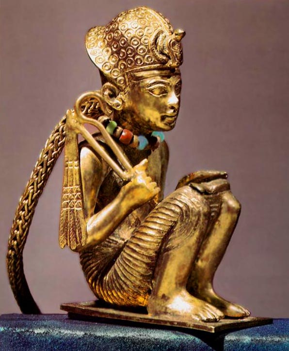 When Tutankhamun was interred in his modest tomb, he was accompanied by this solid gold pendant of a squatting king, suspended on a heavy, woven gold chain. Amenhotep III is shown wearing the Khepresh, or Blue Crown, and holding a scepter and flail, the traditional insignia of Egyptian kings. His feet are bare, and a string of tiny colored beads hangs around his neck.