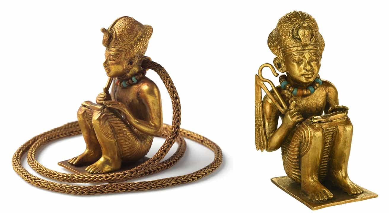 It is believed that the pendant originally belonged to Amenhotep III and was later placed in Tutankhamun’s tomb, perhaps as a symbolic inheritance or as a tribute to the earlier pharaoh. The solid gold pendant depicts Amenhotep III in a squatting position, wearing the Blue Khepresh Crown and holding the crook and flail. He is adorned with a real gold necklace strung with glass beads. The statuette was suspended from a looped gold chain to serve as a pendant.