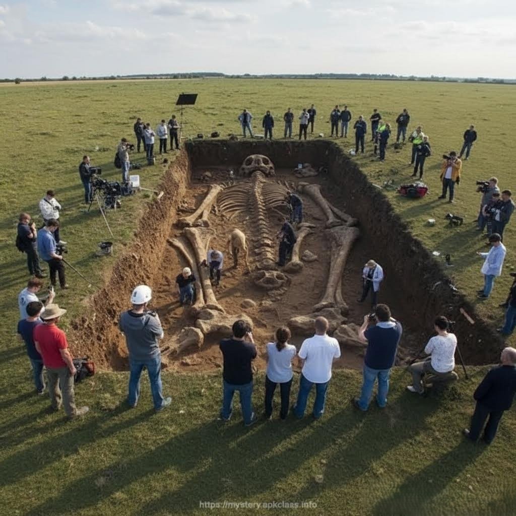 A dramatic drone-captured excavation site has ignited what many are calling the most explosive archaeological controversy of the decade. In a remote stretch of open grassland, far from any known ancient settlement, researchers have uncovered a colossal skeleton—one that appears far larger than any documented human, hominid, or prehistoric species ever recorded. The discovery has sent shockwaves through the global scientific community and beyond.