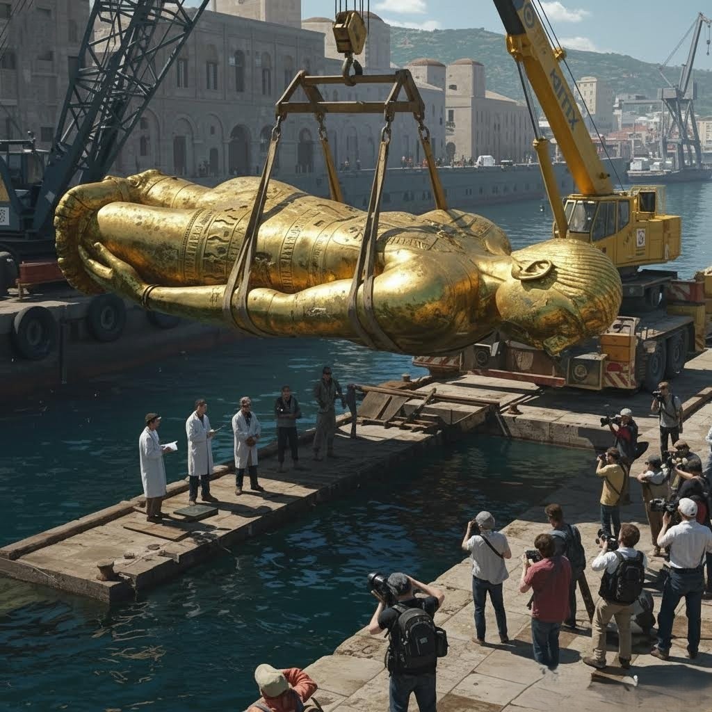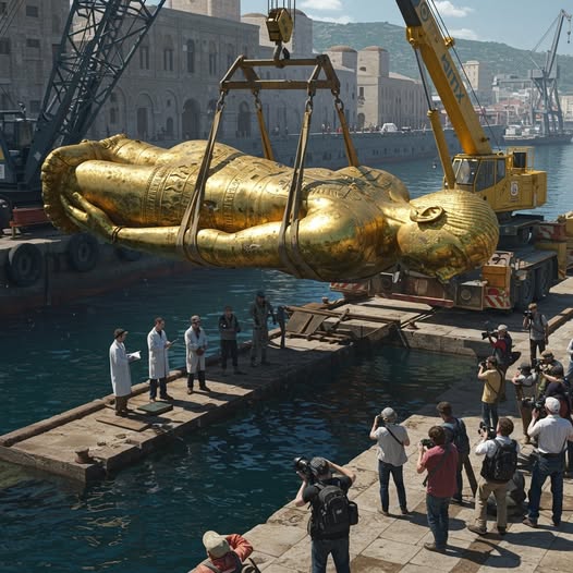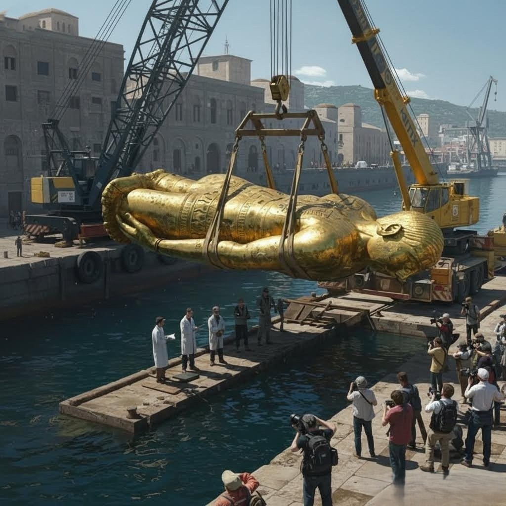 The moment the colossal golden figure broke the surface of the water, silence briefly fell over the crowd before cameras, drones, and whispers rushed to fill it. Suspended by heavy machinery and surrounded by officials, the artifact appeared less like a routine recovery and more like a revelation that had arrived too suddenly, too visibly, to be carefully controlled. For many watching live or through screens across the world, the scene felt historic—and deeply unsettling.