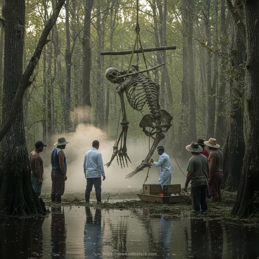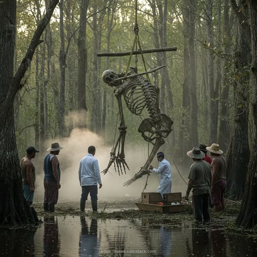 The image of a towering skeleton being lifted from a flooded forest has spread rapidly across the internet, igniting fierce debate and deep unease in equal measure. Half-submerged trees, murky water, and makeshift equipment form the backdrop as locals and researchers stand watching, their expressions caught somewhere between awe and uncertainty. The scene feels raw and unsettling, as though something not meant to surface has been dragged into the open.