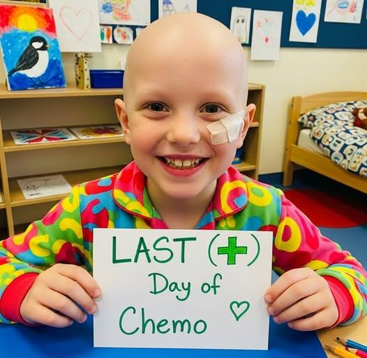 For most children, turning seven means balloons, cake, and laughter. For this child, it means sitting in a hospital room, holding a sign that reads: “Last Day of Chemo.” A smile shines through brave eyes, even as tears fall quietly.