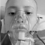 In this image, a young patient sits in a hospital bed surrounded by advanced medical equipment. Behind him, a city skyline stretches toward the sky—symbolizing life continuing beyond hospital walls. In his hands is a simple sign with powerful words: