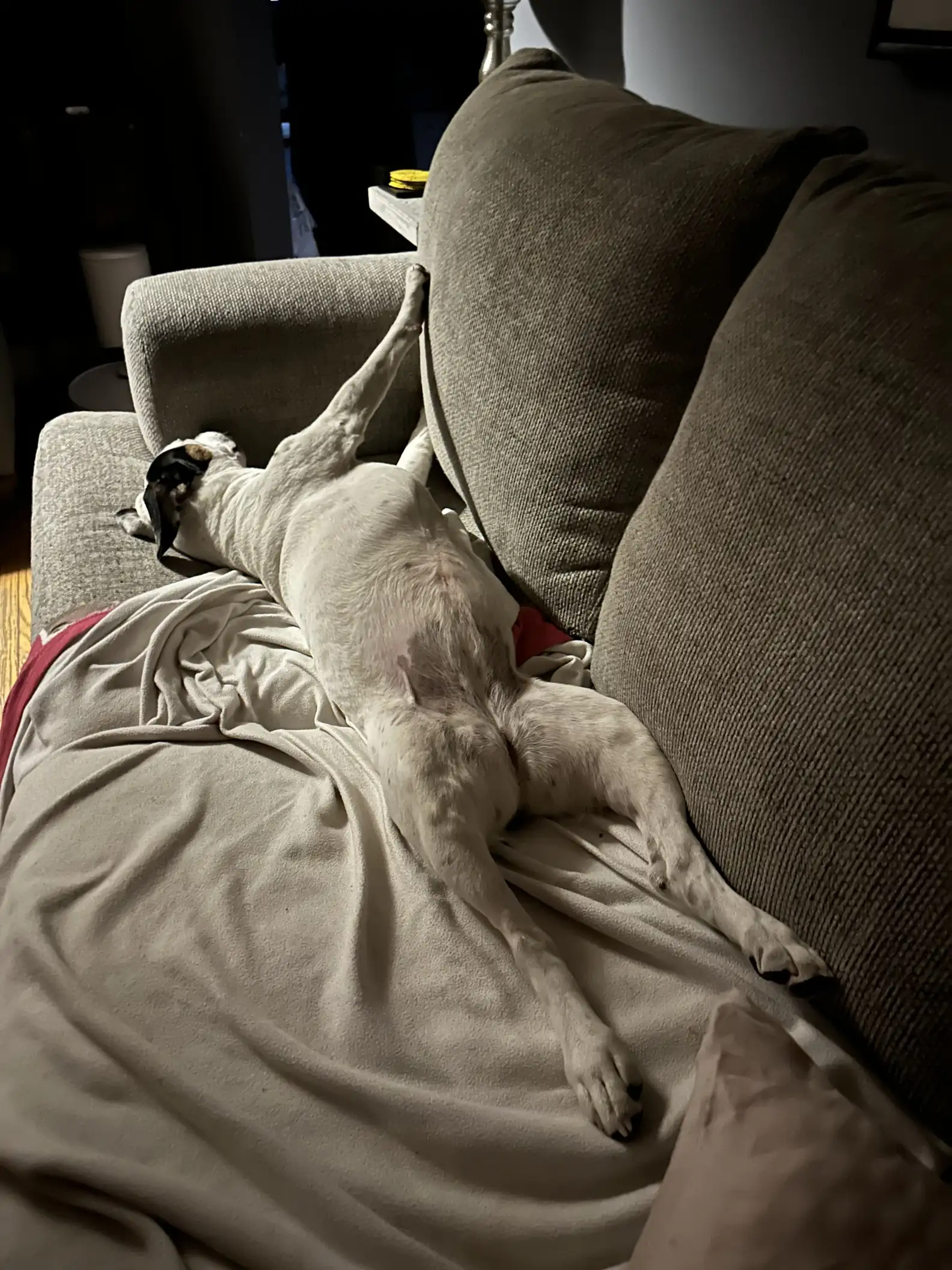 At first, Rain couldn’t sleep. Her chest rose and fell rapidly, panting from anxiety. But sometime around midnight, she sighed deeply, turned on her back, and drifted off in Taylor’s lap — the storm fading into silence.