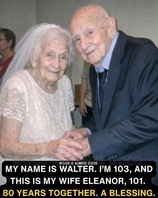 The image of Walter and Eleanor standing hand in hand tells one of those rare stories. He is 103. She is 101. Together, they have shared 80 years of marriage — not as a performance for the world, but as a quiet commitment lived faithfully.