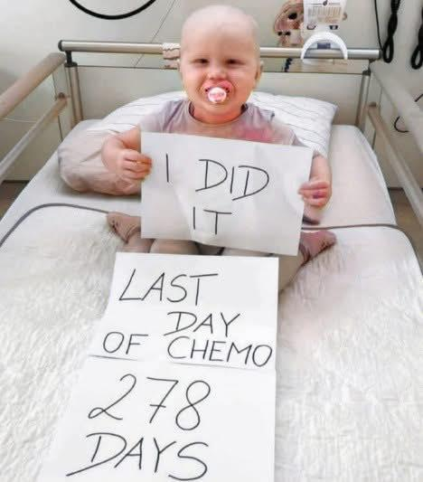 The child in this photo sits on a hospital bed, holding a sign that marks the end of a long and painful journey: 278 days of chemotherapy. There is no need for a long speech, no dramatic explanation. The message is enough.