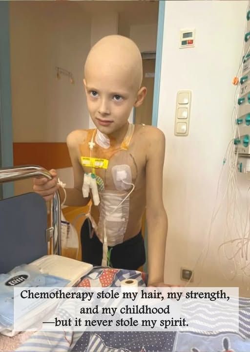 The hospital room is quiet in a way only hospitals can be. Machines hum softly. Clear tubes run from small ports taped carefully against fragile skin. A metal bed rail stands firm, something steady to hold onto when the body feels unsteady. Standing there is a child whose head is shaved smooth by chemotherapy, whose body looks thinner than it should at such a young age, yet whose eyes carry something unmistakable: resolve.