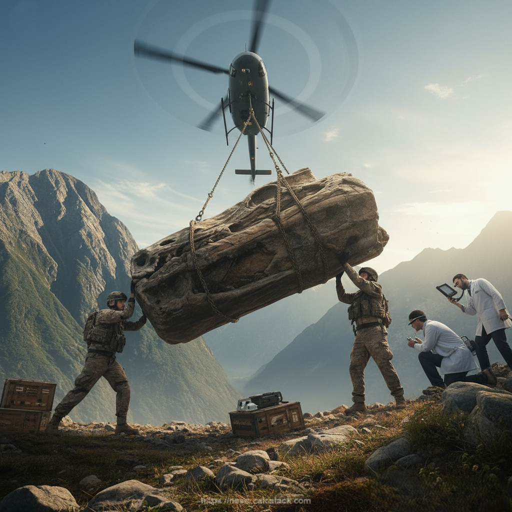 Local mountaineers first reported the find after stumbling upon strange rock formations protruding from a cliff face. When archaeologists arrived to investigate, they realized the “rocks” were in fact massive bone structures, partially fossilized yet remarkably intact. Within hours, the area was cordoned off by heavily armed guards, and an official statement claimed the object was “a naturally eroded formation.” But eyewitness accounts — and leaked video showing helicopters lifting a giant skull wrapped in metallic containment nets — tell a much different story.