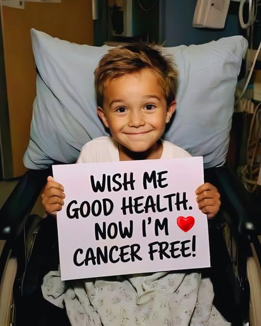 The image of John sitting in a hospital chair, holding a handwritten sign that reads, “Wish me good health. Now I’m cancer free!”, captures a moment more powerful than words alone can describe.