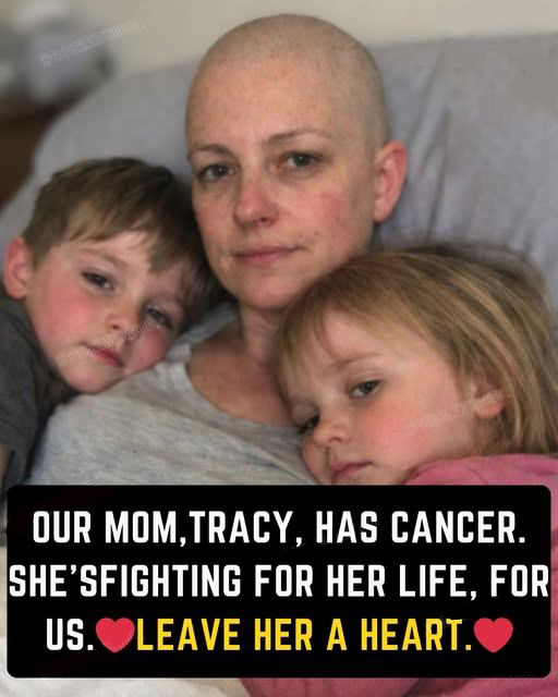 Despite the visible toll of illness, Tracy is still here—still holding her children close, still being their shelter in a moment of fear and uncertainty. Her expression is calm, but behind it lies exhaustion, pain, and courage most of us can barely imagine.