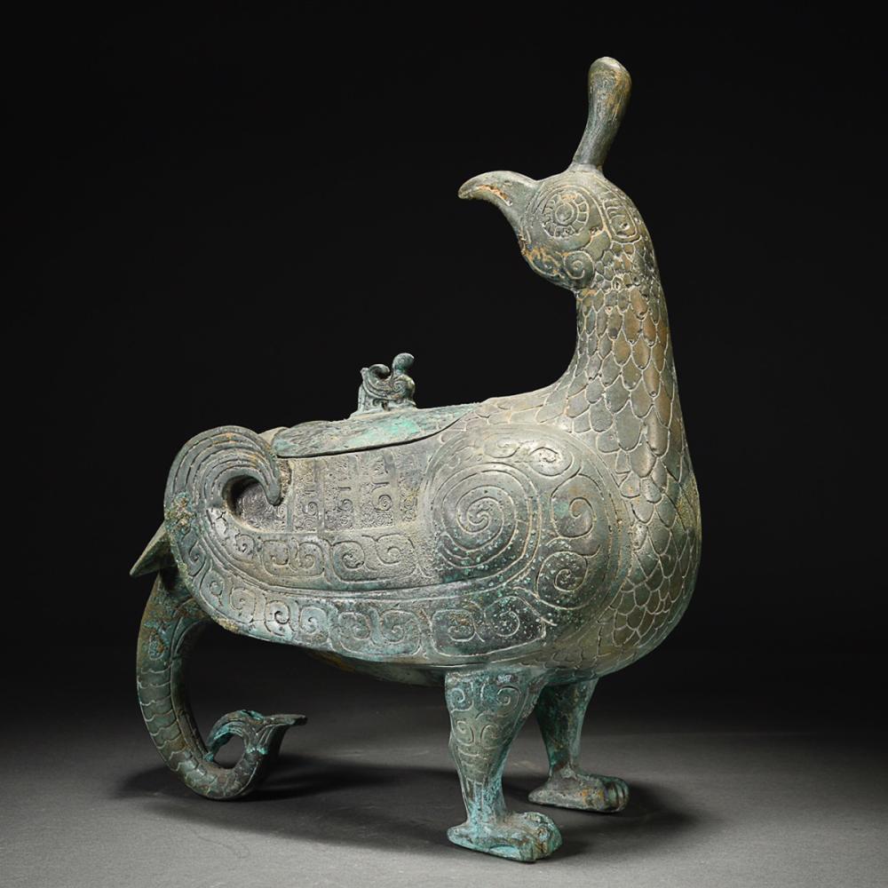 The intricate details, such as the textured feathers and stylized patterns, demonstrate both artistic imagination and technical sophistication, making this piece a striking example of early Chinese ritual bronzework.