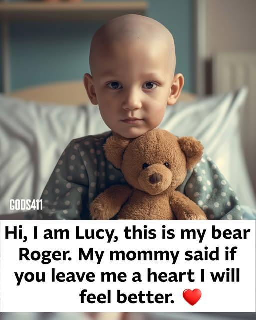 Lucy sits on a hospital bed, hugging her teddy bear tightly. Her head is shaved, her pajamas soft and oversized, her eyes calm but far too serious for someone so young. Roger, her bear, is pressed close to her chest—not as a toy, but as an anchor. A source of comfort. A reminder that she is not alone.