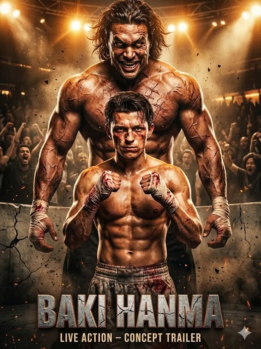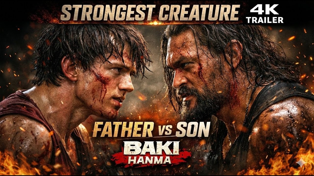 The live-action concept for Baki Hanma imagines a brutal, grounded re-interpretation of one of anime’s most extreme martial worlds. At its core, this is not merely a story about underground fights or superhuman physiques, but a psychological descent into violence as identity. The central image tells the entire story: a young fighter, scarred and bloodied yet resolute, standing in the shadow of an overwhelming figure who is both his father and his greatest terror.