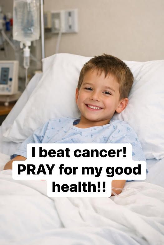 A hospital bed is not where most childhood victories are celebrated. Yet in one powerful moment, a young boy lies against white pillows, smiling brightly, holding a sign that reads: “I beat cancer! Pray for my good health!”