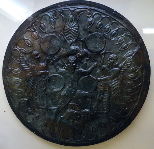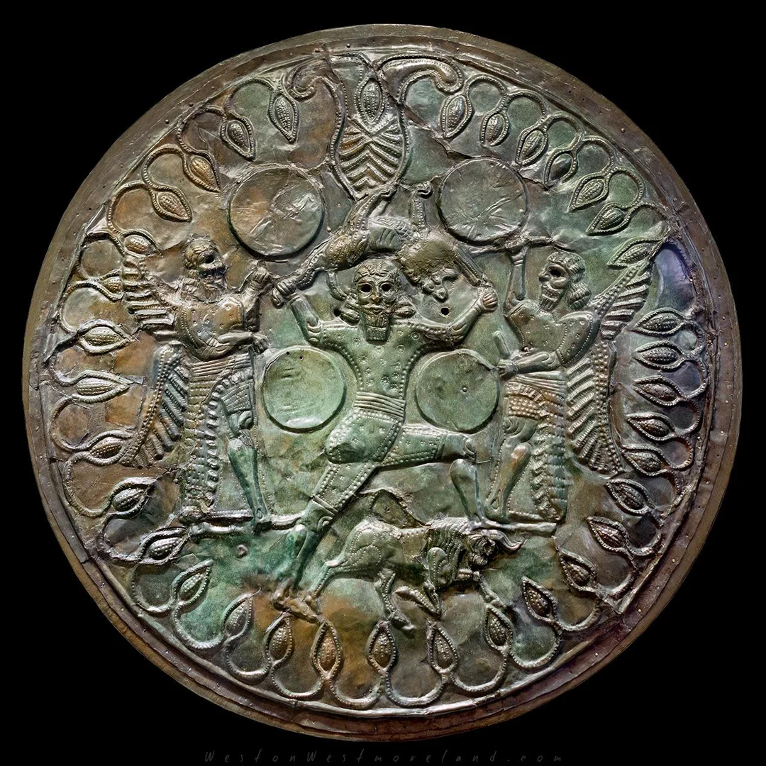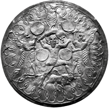 This bronze tympanon stands out for the religious significance of its elaborate decoration. At the center of the disc is a commanding, bearded male figure seizing a lion, his left foot pressing on a bull. Flanking him are two winged “daemons” of Assyrian origin, each holding similar drum-like discs. The composition is framed by an intricate floral motif.