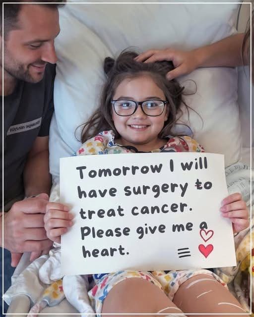 The sign she holds reads, “Tomorrow I will have surgery to treat cancer. Please give me a heart.” It is not a plea for toys, gifts, or comfort items. It is a request for connection. For reassurance. For the reminder that she is not alone.