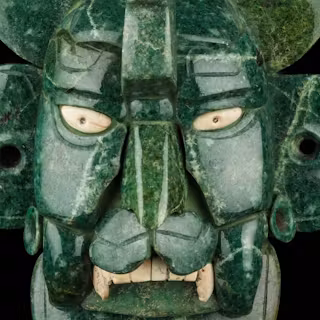 Made from green jade, a precious material for the Maya, the mask is composed of carefully fitted pieces to form a lifelike face, highlighting features such as the pronounced nose, sunken eyes, and slightly parted lips.