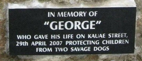 “In memory of George, who gave his life on Kauae Street on April 29, 2007, to protect children from two wild dogs.”
