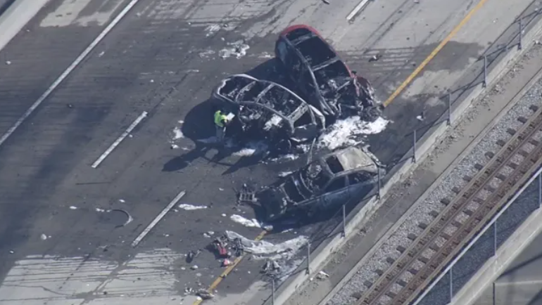 Authorities report that a violent chain-reaction collision involving four vehicles suddenly brought traffic to a standstill. The impact triggered a catastrophic fire. Two Teslas and a Lexus were rapidly consumed as flames tore through twisted metal, sending thick black smoke billowing into the sky. Witnesses described a scene of chaos — drivers scrambling to escape, bystanders attempting to help, the sound of explosions as the blaze intensified.