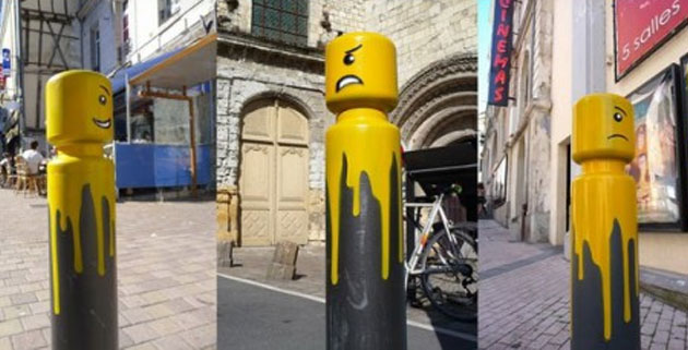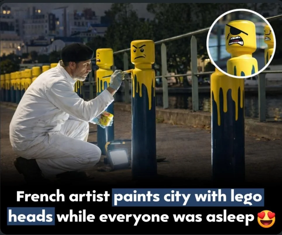 Behind these whimsical transformations is Le CyKlop, a French street artist known for reimagining urban furniture. His signature style? Turning dull metal posts into vibrant characters, often inspired by the iconic heads of LEGO figurines.